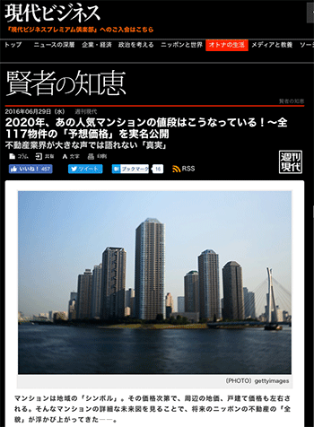 「2020年、あの人気マンションの値段はこうなっている!~全117物件の「予想価格」を実名公開 」という記事が、現代ビジネスに掲載されています。