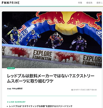 「レッドブルは飲料メーカーではない?エクストリームスポーツに取り組むワケ」という記事が、FNN.jpプライムオンラインに掲載されています。