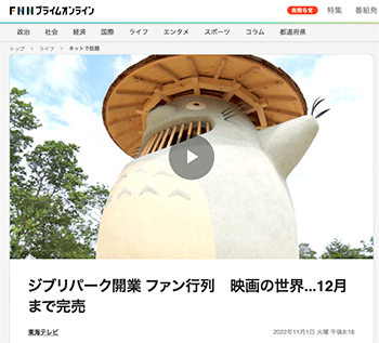 ♺エンタメ(リンク切れ)「ジブリパーク開業 ファン行列 映画の世界…12月まで完売」というジブリパークが開業したことを伝えている動画ニュースが、FNNプライムオンラインにて公開されています。